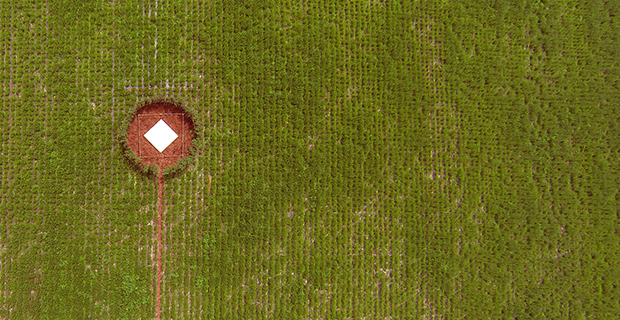 Fase 5: Febbraio-Aprile. Coltivazione. Quando le piante crescono attorno alla piattaforma quadrata si forma un vuoto ben visibile da una vista aerea. Il progetto definisce una postazione lavorativa, un’organizzazione consequenziale e un’architettura economica, sostenibile e soprattutto facilmente replicabile dalla popolazione locale.