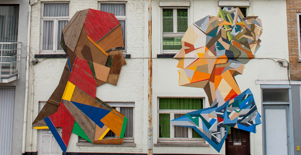Stefaan De Croock usa materiali di scarto per creare murales tridimensionali. Lo street artist -pseudonimo Strook- applica sulla facciata di edifici oggetti di legno riciclato, componendo un mosaico di cui vecchie porte, pannelli di mobili, pavimenti inutilizzati sono le tessere.